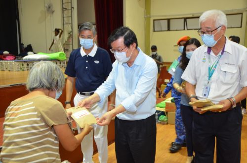 首长一行人也派发由桥格集团(Quinton Group)报效的卫生用品袋,里头包括湿纸巾、洗手液及口罩。