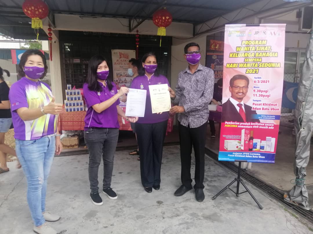 எனவே, பத்து உபான் மகளிர் மற்றும் குடும்ப மேம்பாட்டுக் குழுவின் ஏற்பாட்டில் அவ்வட்டாரத்தில் வாழும் மகளிர்களை அங்கீகரிக்கும் பொருட்டு இலவசமாக சுகாதார பொருட்கள் வழங்கப்பட்டன. இத்திட்டத்தின் கீழ் தகுதி பெற்ற 150 மகளிர்களுக்கு இச்சுகாதார பொருட்கள் வழங்கப்பட்டன.