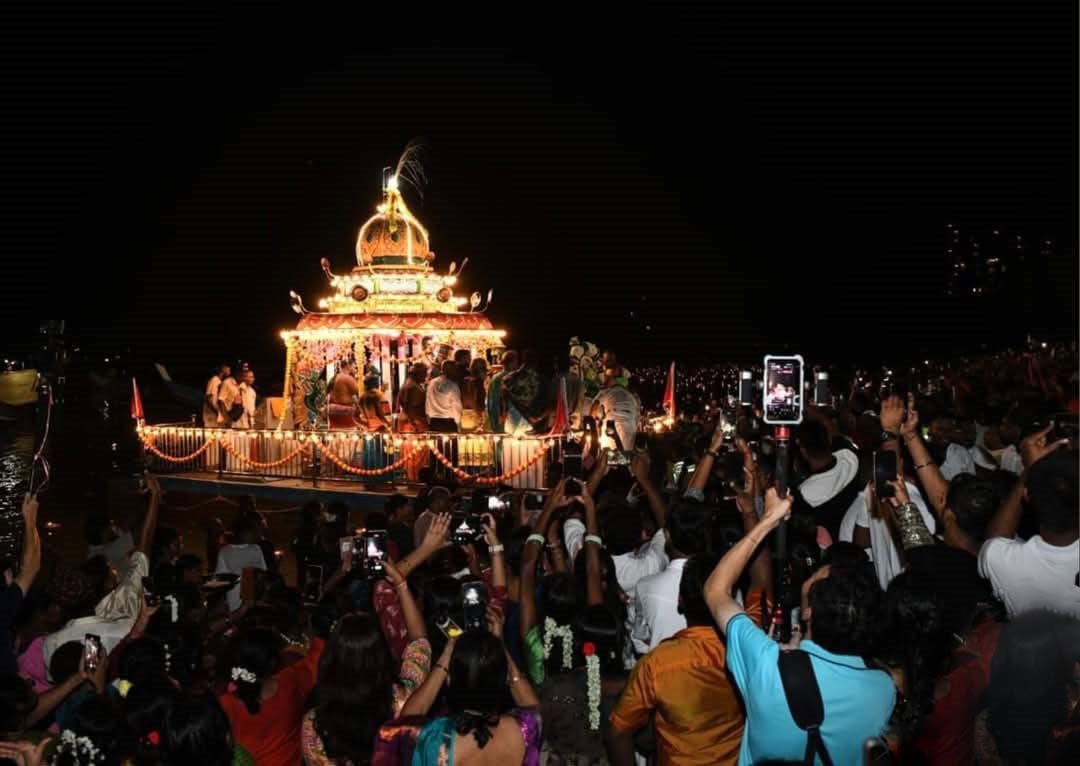 மிதக்கும் தேரை இரு படகுகள் மூலம் இழுத்தவாறு கடலின் ஒரு பகுதிக்குக் கொண்டு சென்று மீண்டும் அத்தெப்பத்தில் பவனி வந்த அம்மனை ஆலயத்திற்கு கொண்டு வந்து சிறப்புப் பூசைகள் நடத்தப்பட்டன.