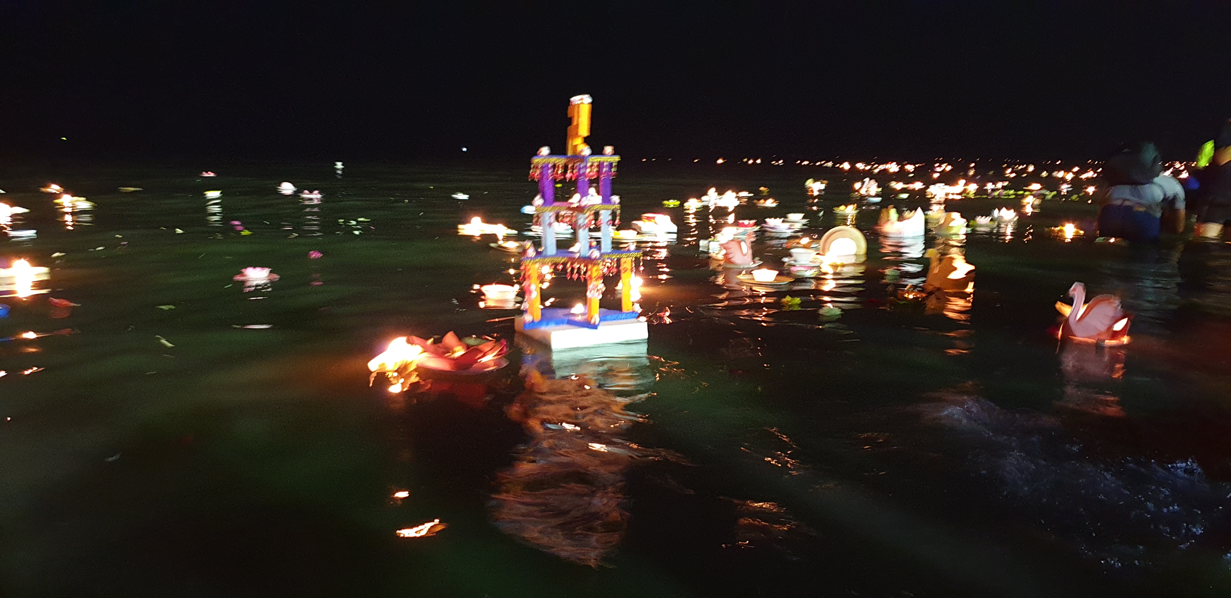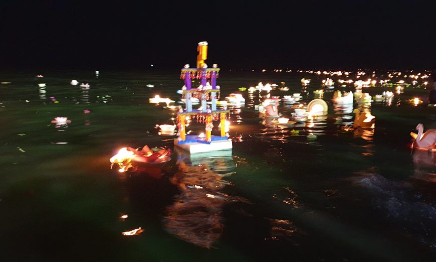மாலையில் வண்ணவிளக்குகளால் அலங்கரிக்கப்பட்ட தெப்ப ஊர்வலம் நடைபெற மக்கள் சிங்க முகக் காளியம்மனின் திருவருளைப் பெறும் பொருட்டு தங்கள் எண்ணங்கள் நிறைவேற மனமுருகி வேண்டி மிதவை விளக்குகளைக் கடலில் விட்டனர்.