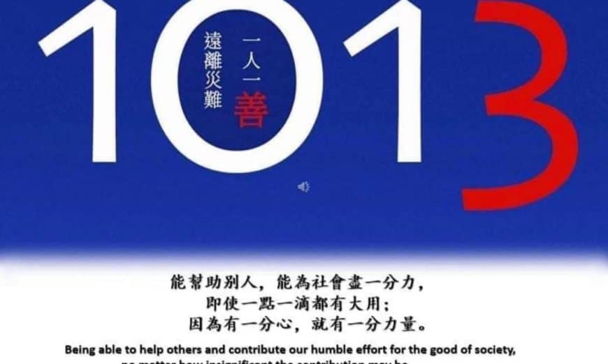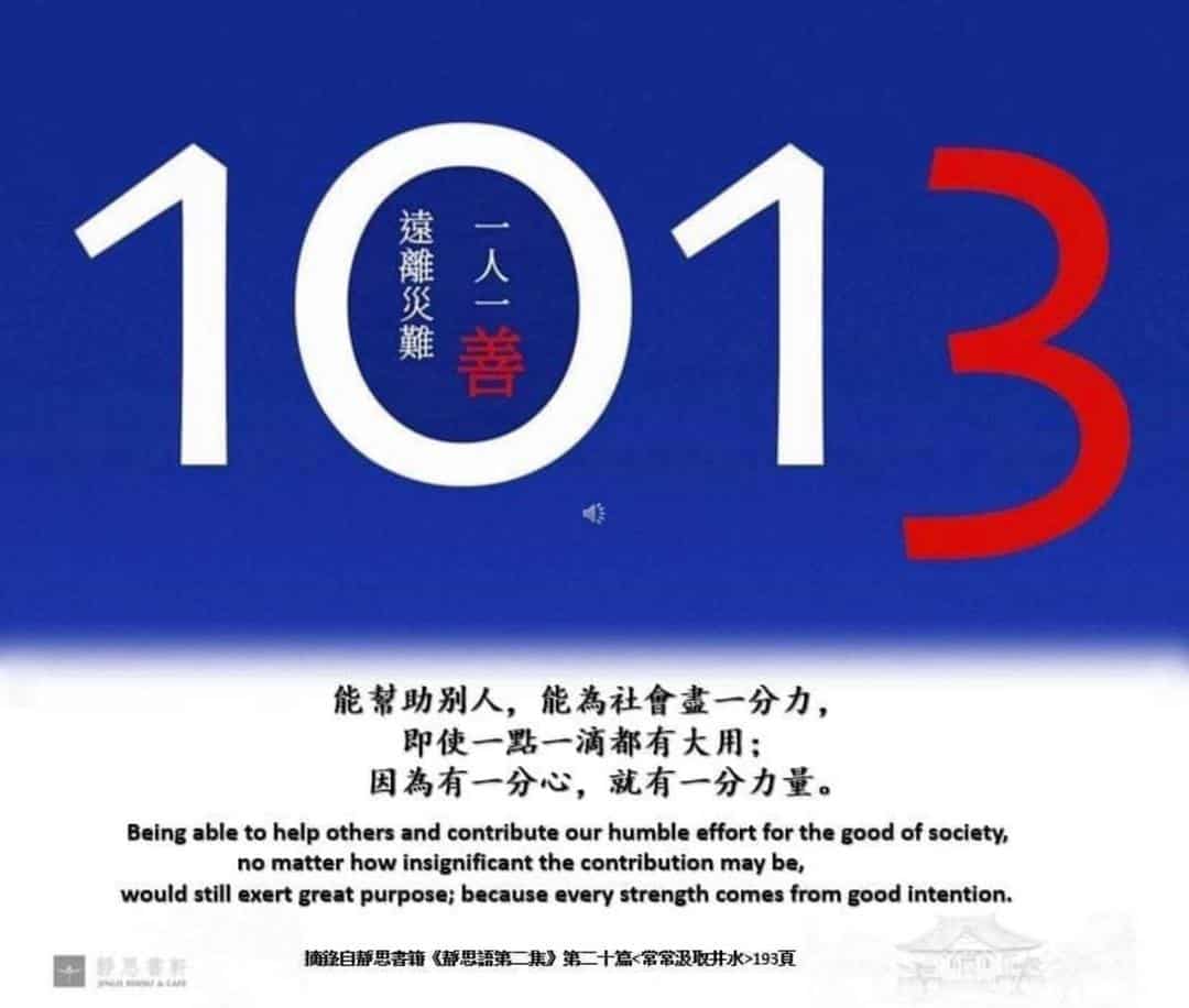 有关筹款运动源自2001年,台湾遭受桃芝、纳莉颱风侵袭,美国发生“911事件”。从那个时候开始,慈济发起人证严法师一直思考如何安抚人心、消弭灾难,到10月13日这一天,决定用一人一善,1013的谐音,发起“一人一善,远离灾难”的爱洒人间行动,呼吁每个人发挥一念善念。