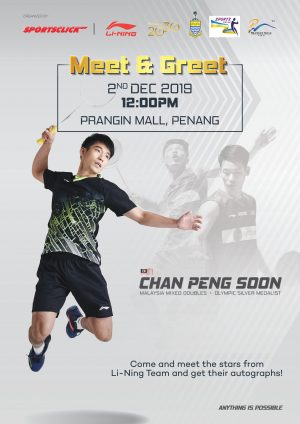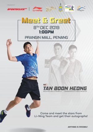 羽球国手陈炳顺和陈文宏将于2019年12月2日至8日,新光大广场(Prangin Mall)参与2019全民运动展销会(Fiesta Sukan Untuk Semua Pulau Pinang2019) 的“星光熠熠”活动。