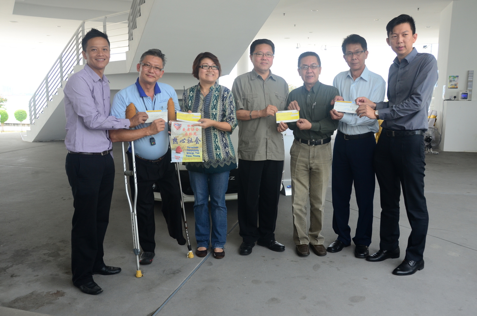 林秀琴(左3)及日落洞区国会议员黄泉安(中)移交善款给恩典乐龄苑主席邱得意(左2)及善心残障儿童福利中心院长刘锦凯(右3)。