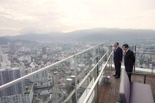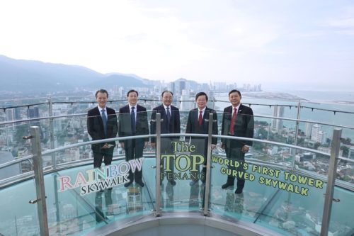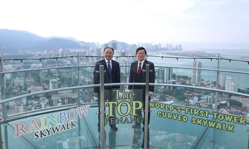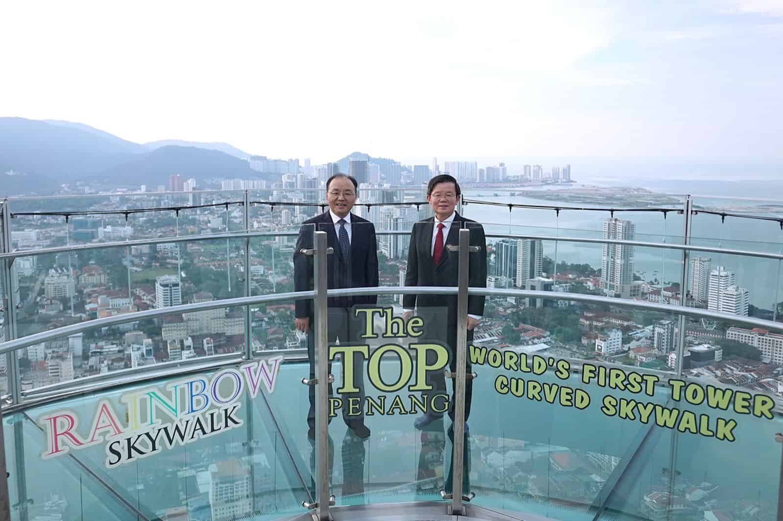 首次访槟的中国驻马大使欧阳玉靖,受槟州首席部长曹观友邀请,站上249米高的光大68楼彩虹天空步道上,俯瞰槟城怡人景色!