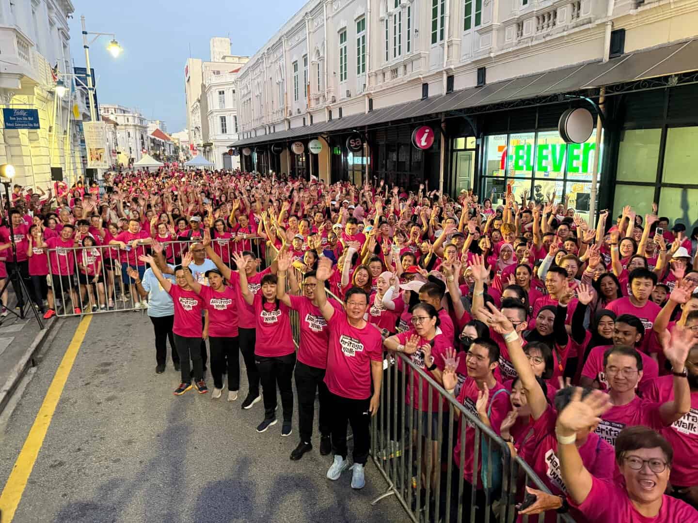 ///图说:乔治市古迹行开幕礼上,曹观友(前排右起)、洪敏芝、林慧英、郑来兴、峇拉蒂、王宇航、拉詹德兰与民众齐欢呼,振奋士气!