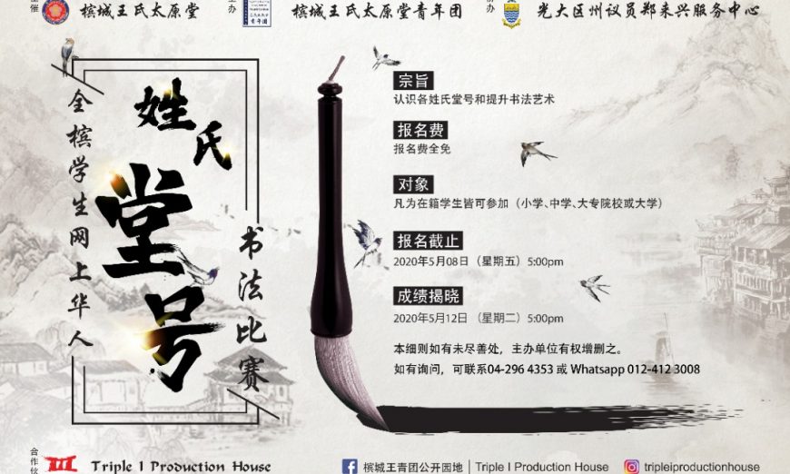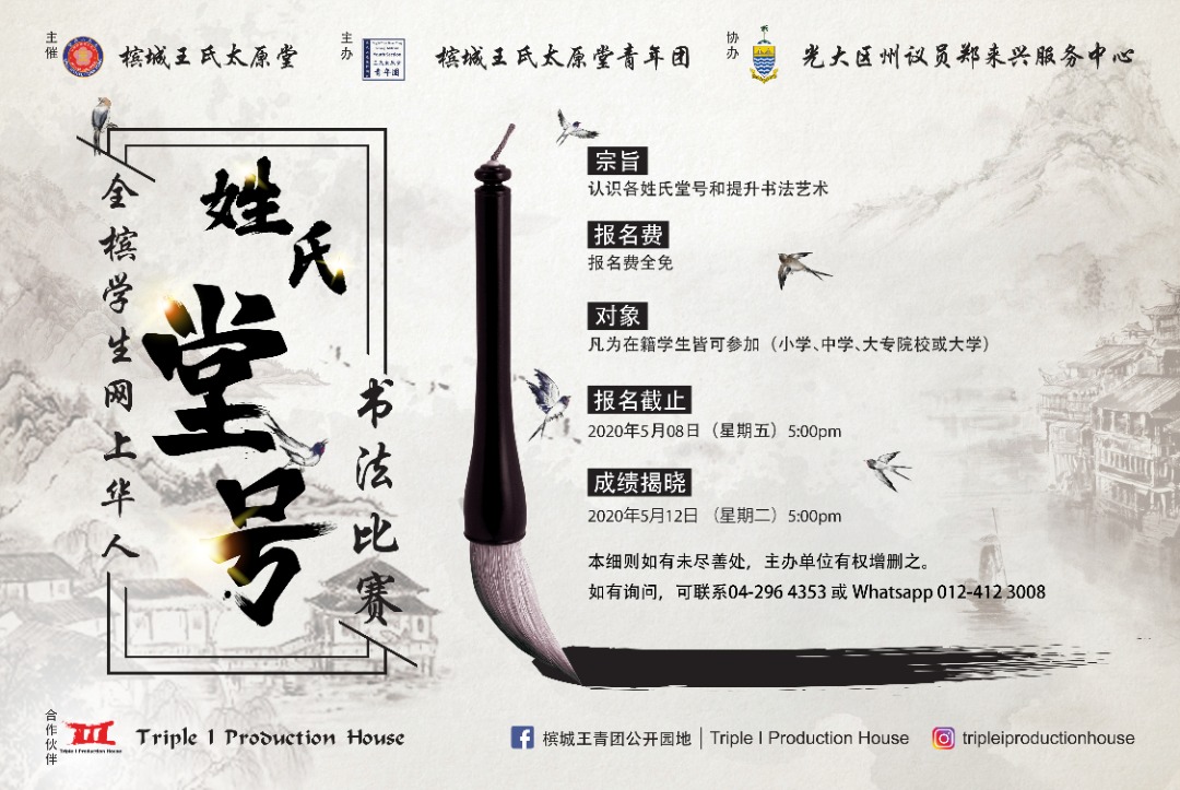 由槟城王氏太原堂主催、槟城王氏太原堂青年团主办、光大区州议员郑来兴服务中心协办及Triple I Production House为合作伙伴的【全槟学生网上华人姓氏堂号书法比赛】正式开放报名!槟州在籍学生(小学、中学、大专学院或大学)皆可免费参加这次的书法比赛,而比赛作品将在2020年5月8日(星期五)下午5点截止报名。
