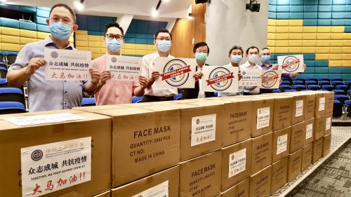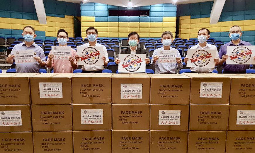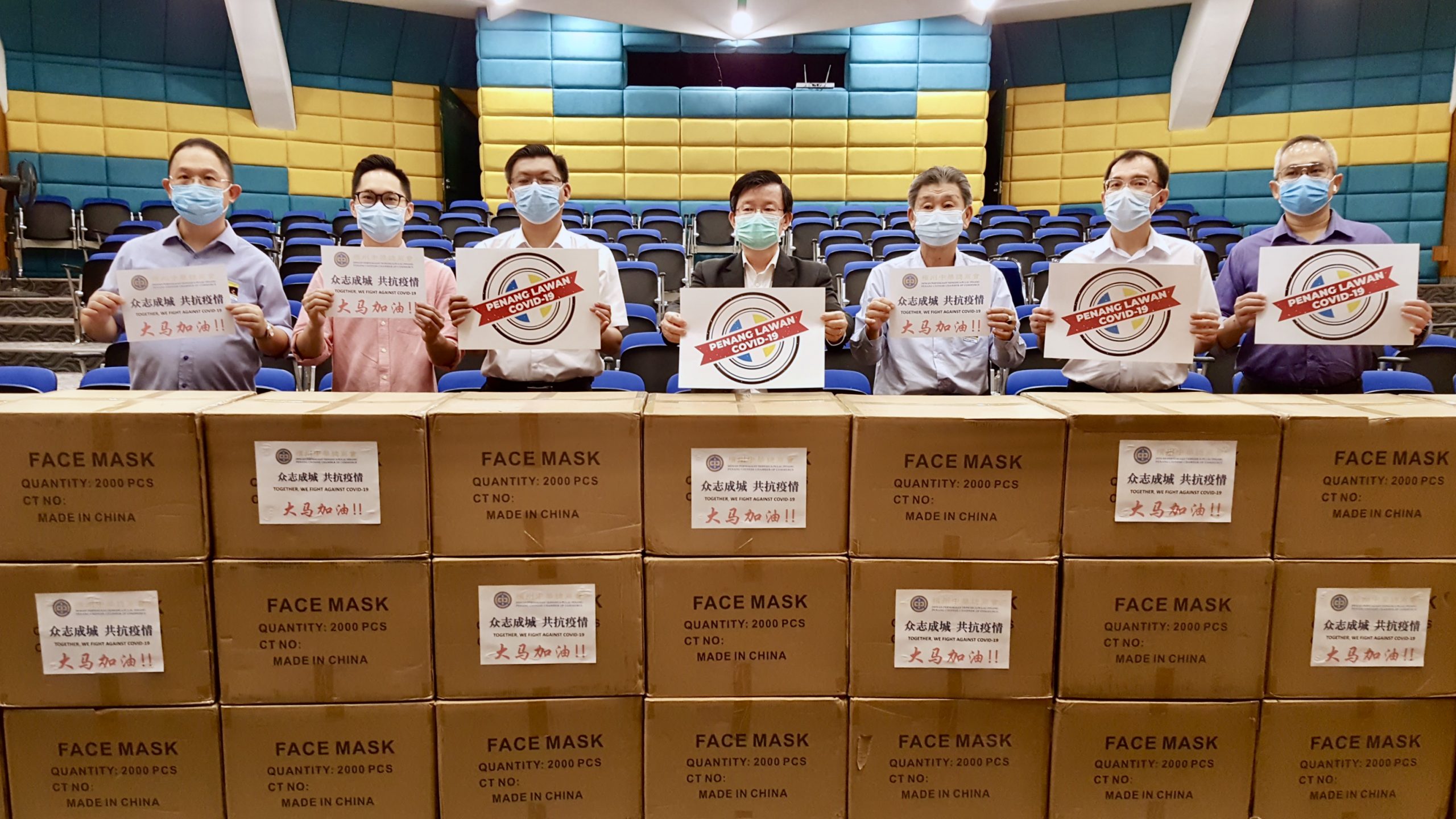 槟州中华总商会则移交10万片口罩予槟州政府,中总一行人包括会长拿督斯里方炎华、执行董事黄智杰、张家朢与林智栋以及秘书骆荣伟。