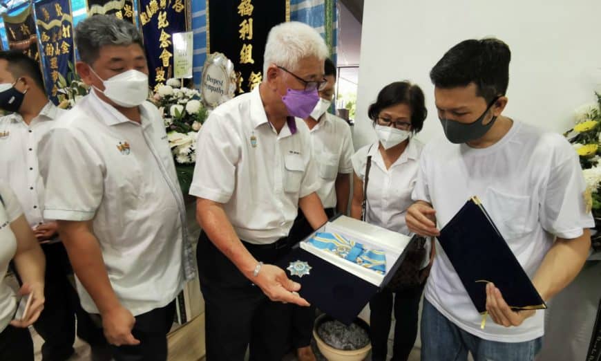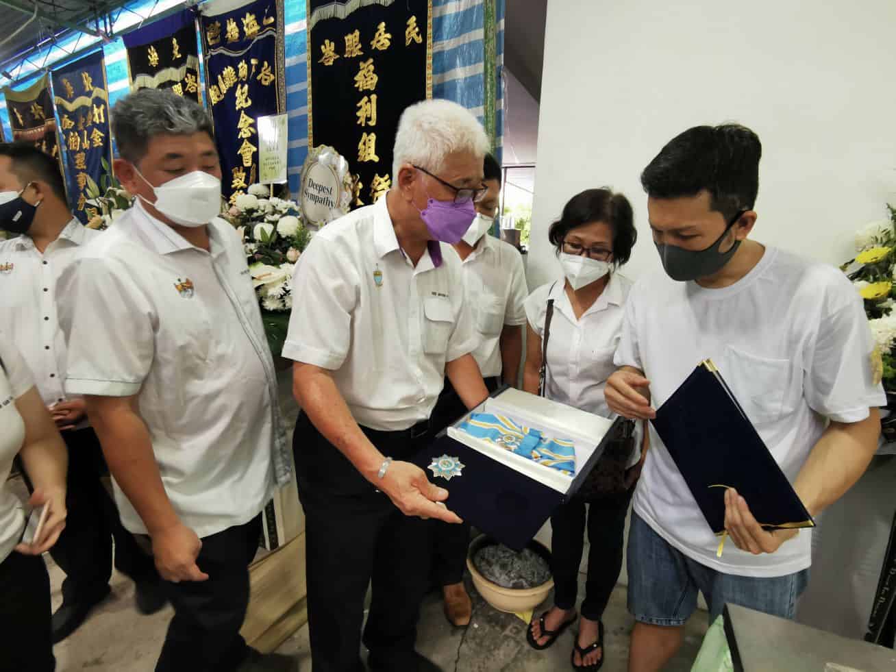 于今年受封拿督勋銜的洪敬翔,因病不幸逝世无缘接领勋衔,槟州行政议员彭文宝特于周二把拿督勋章移交予家属,肯定洪氏为社会贡献的精神。