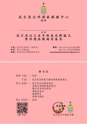 吴俊益诚邀民众于1月27日(周日),晚上7时30分至晚上10时前来武吉淡汶老街(Rumah Warisan Bukit Tambun) 警察局旁参与武吉淡汶选区举办的新春门楼及灯笼亮灯仪式和迎春宴,共享新鲜美味的海鲜火锅及观赏精彩表演。