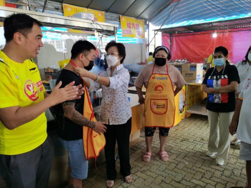 槟城珍珠议员夫人协会与峇眼惹玛区州议员孙意志,分派100件围裙予北海新芭观音亭斗母宫素食摊小贩,以冀商贩在九皇诞期间,为民众提供卫生素食。
