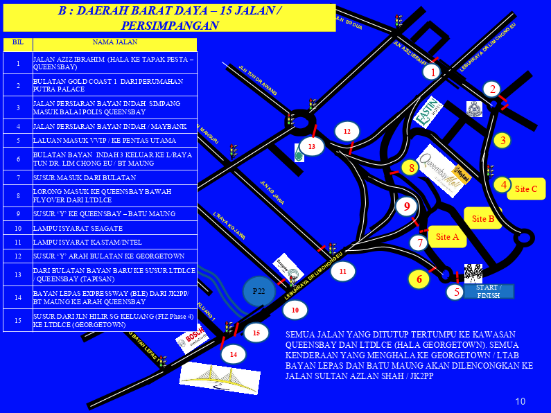 槟州旅游发展委员会主席杨顺兴和槟州交警调查及执法组主任旺沙鲁丁今日召开新闻发布会指出,今年封路路段与往年一样,受影响路段包括敦林苍祐医生大道、皇后湾和威中往大桥路段,涉及共26条道路。