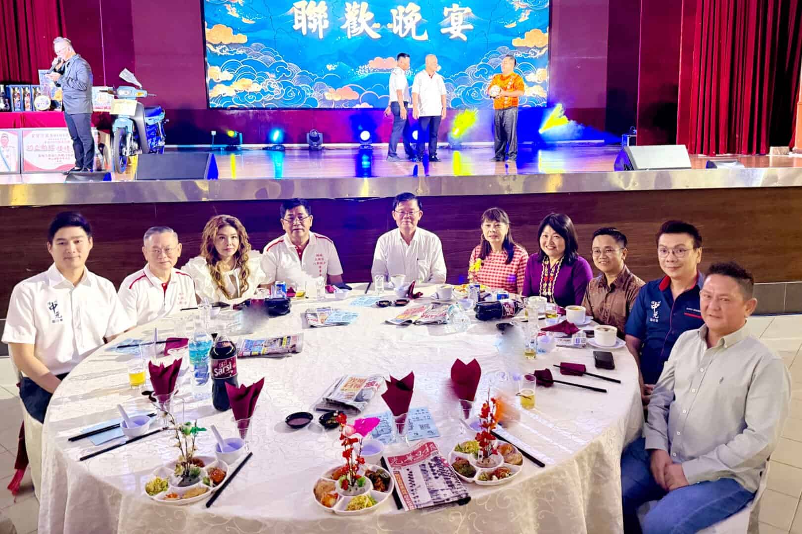 ////图说:槟城大街区八街联合盂兰胜会联欢晚宴主桌嘉宾合影,左起:叶福磷、戴良成、王美莲、陈人彬、曹观友、林慧英、林秀琴、王宇航、洪杰生及陈詠隆。