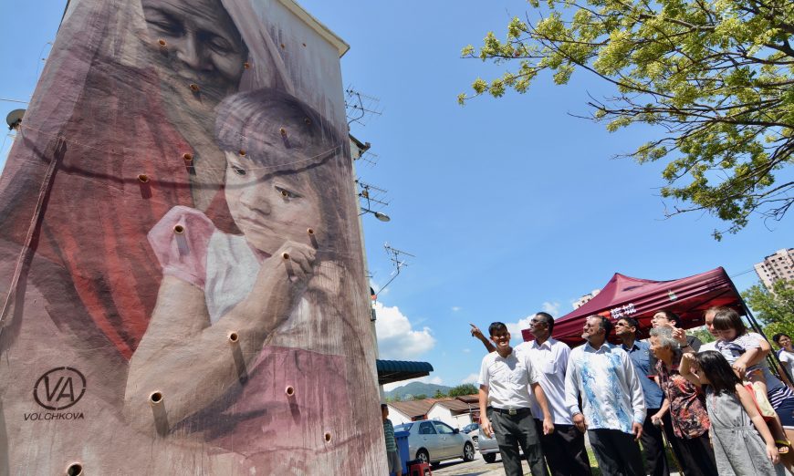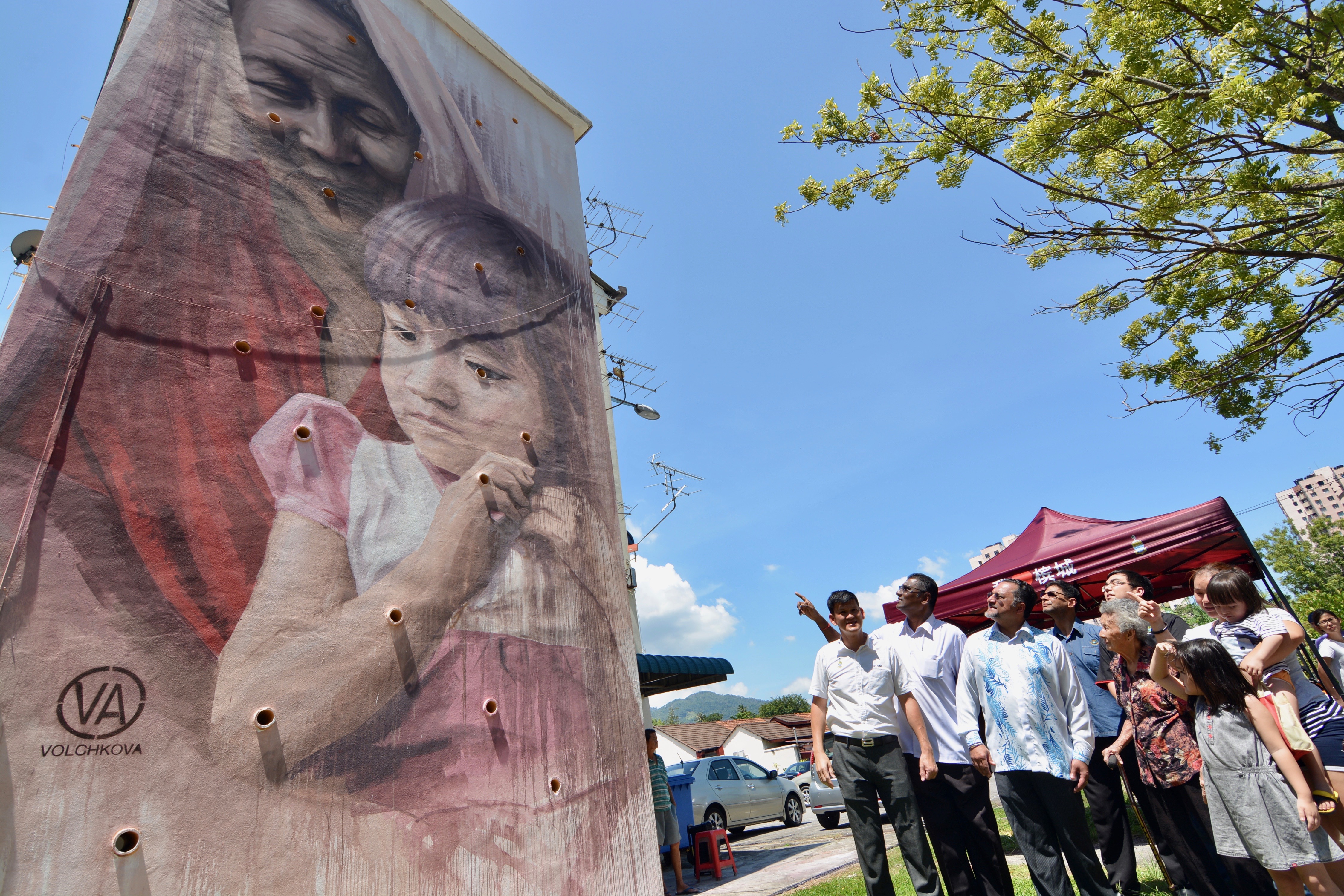 峇都兰樟“祖孙情”巨型壁画已完成,画中人李素珍(87岁)和其曾孙女温紫彤(2岁)今日更受邀同往参观壁画,对能成为“画”题人物感到高兴。
