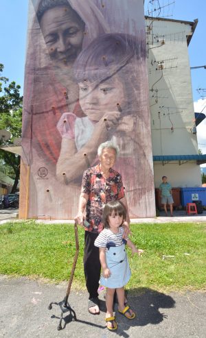 “祖孙情”巨型壁画灵感取自峇都兰樟真人真事。住在大路后的温耀伦因中风瘫痪,一家六口顿失经济支柱,而李素珍更需肩负起照顾曾孙的责任。