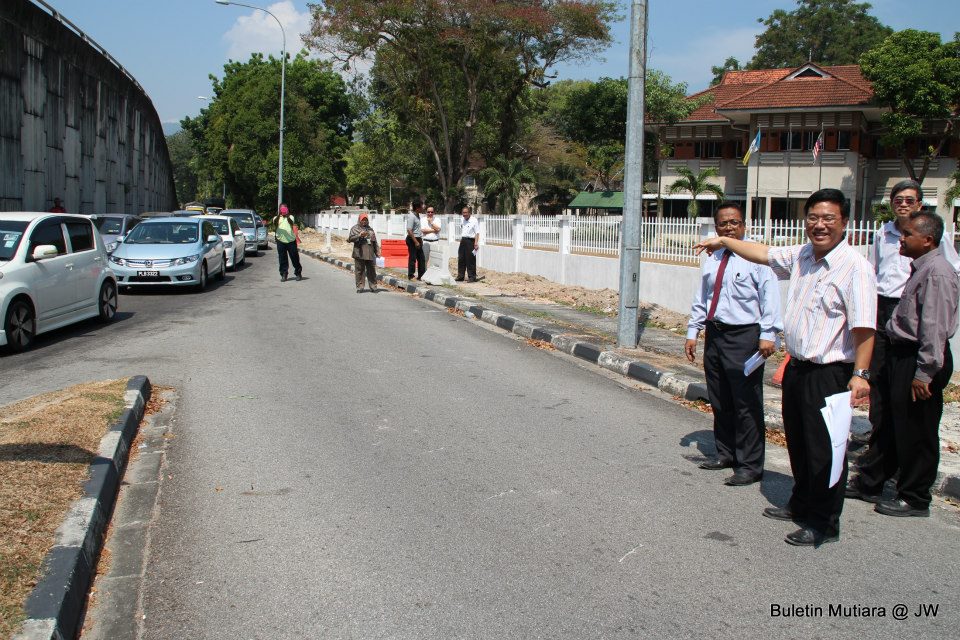 黄汉伟(右1)巡视峇都兰樟道路加宽计划后表示,该工程目前已竣工23%,而为了避免车流量高峰时期车子因阻塞而不能左转入州回教堂路,因此,当局向东北县县长官邸征用2.2公尺土地,以加宽左转车道。