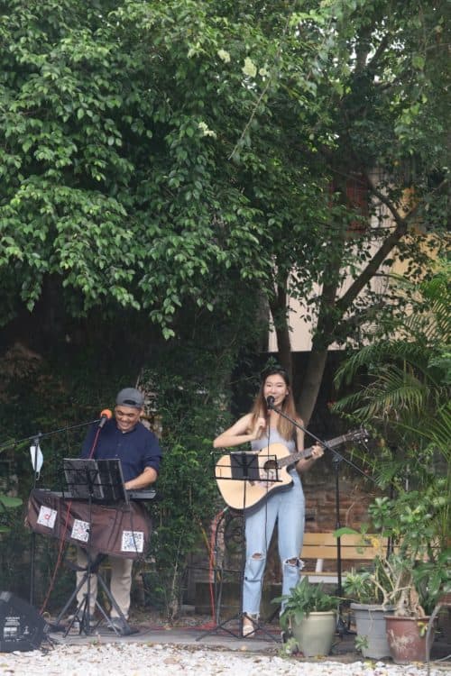 接着由刘立业带领的5人乐队继续演出,他活跃于槟城歌曲创作界多年,曾经参加滚石唱片的比赛,并获得李宗盛颁发“原创精神奖”。音乐会跟着由近年崛起的专业组合“Mabel&小强”;他们超强的场控能力,把观众情绪带到最高点!