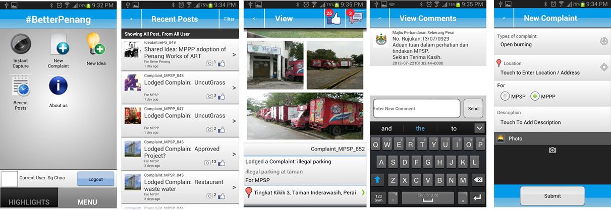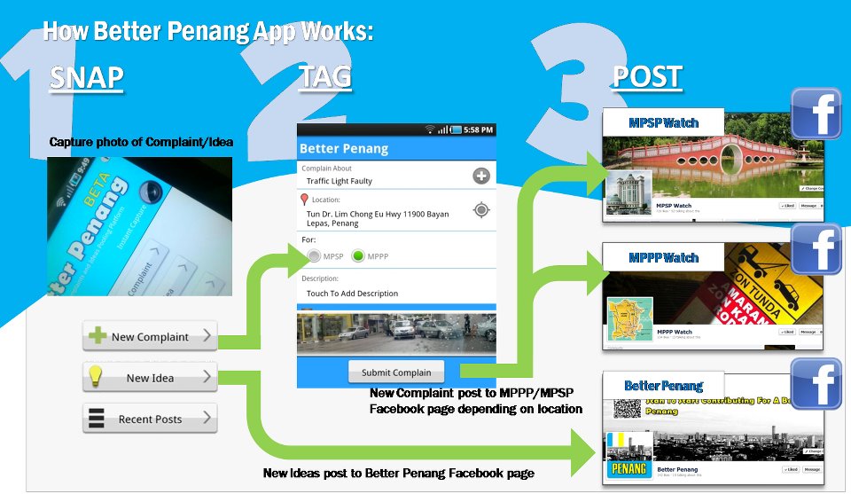 槟威两地市政局推出名为市民行动科技的手机应用从程式,让市民能够简单地作出投诉而不再需要填写表格,更不需要前往市政局,而只是简单的“拍、标签、上载”3个步骤完成,让市民参与社会监督工作。