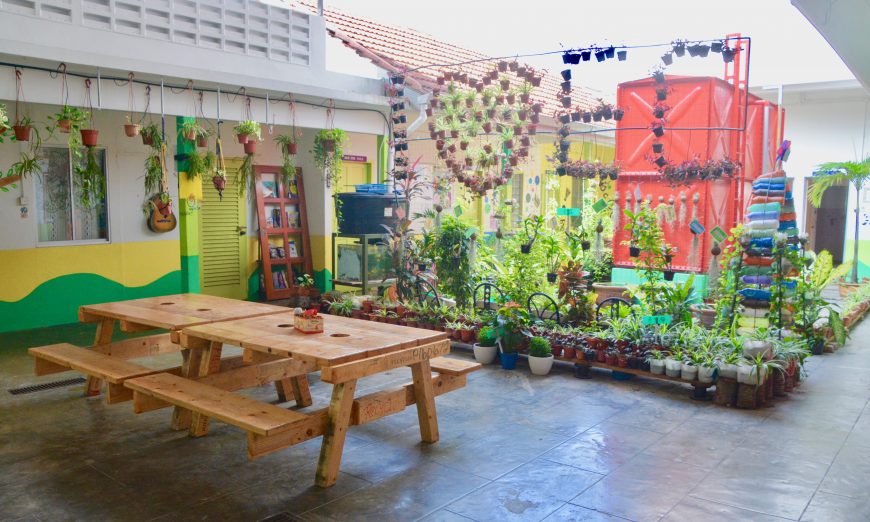 此外,校方也打造了一个在花园旁的阅读角落,那些精美桌椅都是校友们用回收板制造而成。学生们也乐于在綠意的花园旁阅读,这让他们在阅读当儿也能感到一丝绿意,心情更愉悦。