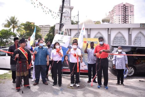 槟州首长曹观友今天在日落洞国会选区“爱槟城”走透透活动上,前往瑟丽娜园(Taman Serina)出席与人民集会活动上,为上述应用程序主持推展礼。