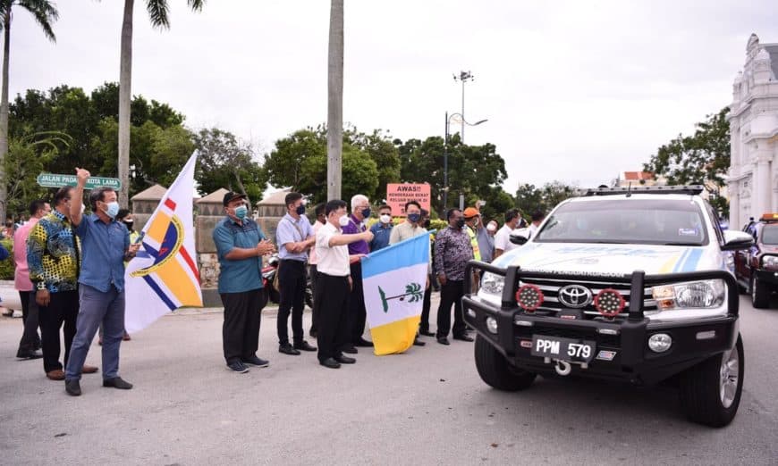 槟州首长曹观友、槟岛市长拿督尤端祥、掌管环境及福利事务的彭文宝行政议员、旅游及创意经济事务委员会主席杨顺兴、青年体育事务委员会主席孙意志、黄汉伟国会议员、州议员王耶宗、郑来兴、黄顺祥、魏子森、阿兹鲁、一众市议员等,在出发地点,即旧关仔角市政厅大厦前,给予赈灾队伍打气及祝福。(图下)