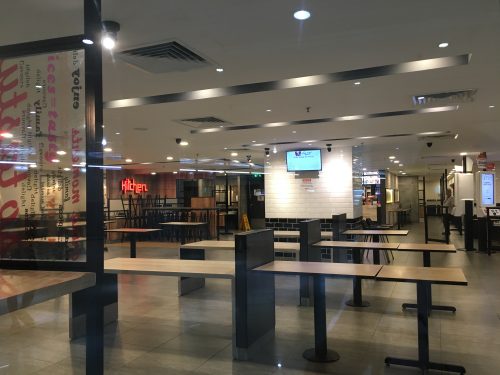 商场内的快餐店、餐馆等同样都收起桌椅,并列明只提供外带服务,不准堂食。