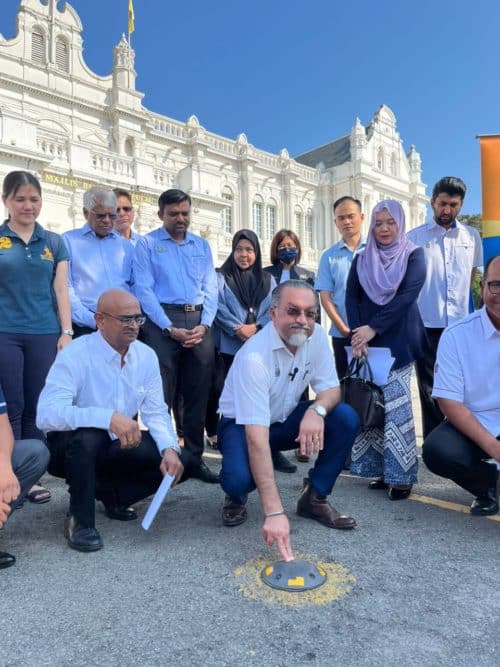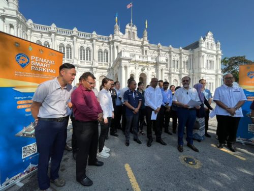 记者会出席者包括:槟岛市政厅秘书拿督拉詹德兰、智能泊车系统承包商 HeiTech Padu Berhad 首席執行员阿都哈林,以及多位槟岛市议员。