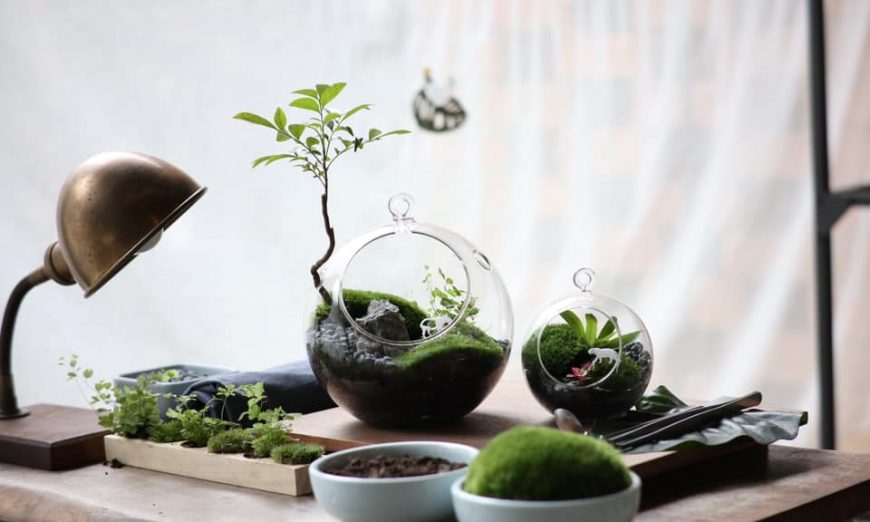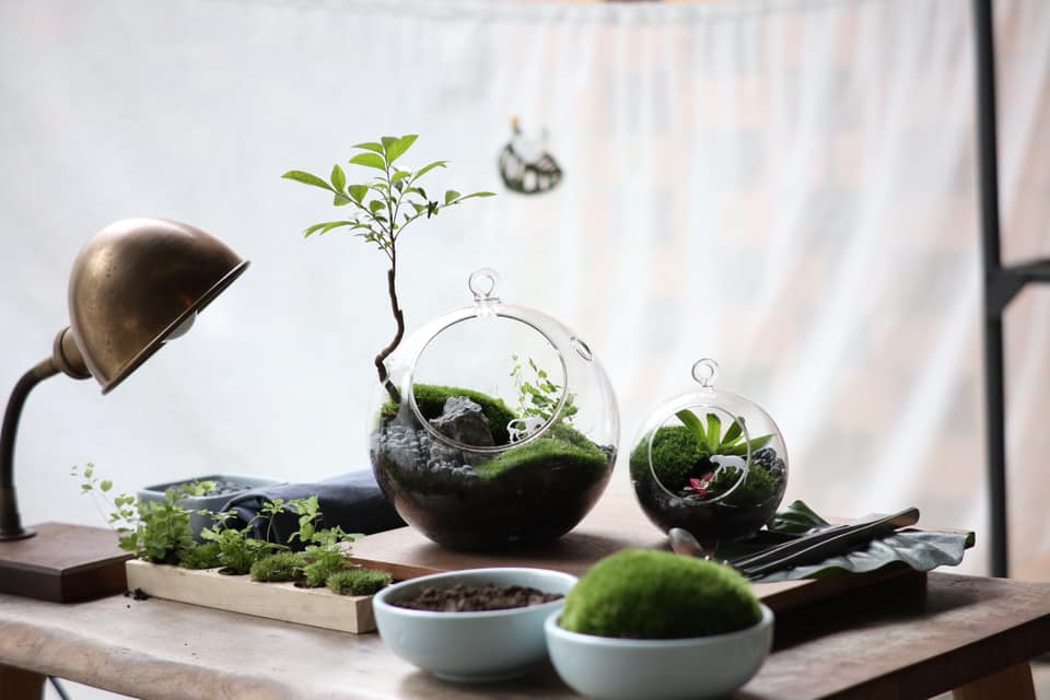 他解释,“瓶中森林”所使用的玻璃瓶子体积较小,但形状多样化,有球形、圓筒形、橢圓形等等。由于这类玻璃瓶有开放式的瓶口,水分会流失,因此需要每周两次进行喷洒水分,而瓶中的苔藓就发挥了作用,吸收多余的水分,再慢慢地释放,让植物处在良好状态。