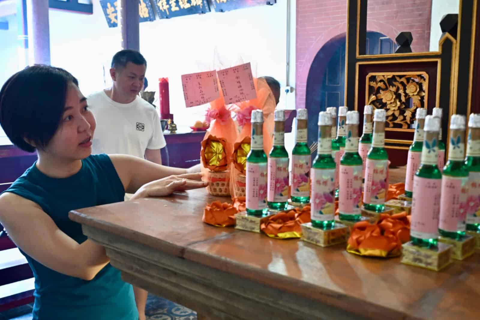 这也是大伯公街福德祠自2023年为花姑开炉后迎来的第2个花姑诞,庙内香火鼎盛,善信络绎不绝,场面热闹非凡。众多单身男女特意到来祈愿,还有不少为子女姻缘操心的父母参与其中,而觅得佳偶的善信亦来诚心还愿。