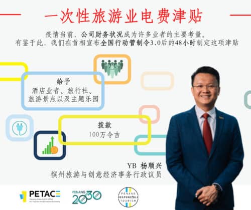 不久前,槟州旅游与创意经济事务委员会主席杨顺兴宣布,槟州政府给予槟州旅游业者一次性电费津贴从5月24日起至6月25日开放申请,须符合条件。公开予州内酒店业者、旅行社、旅游景点以及主题乐园申请,符合申请条件的业者可浏览www.pdc.gov.my 提交申请表格。
