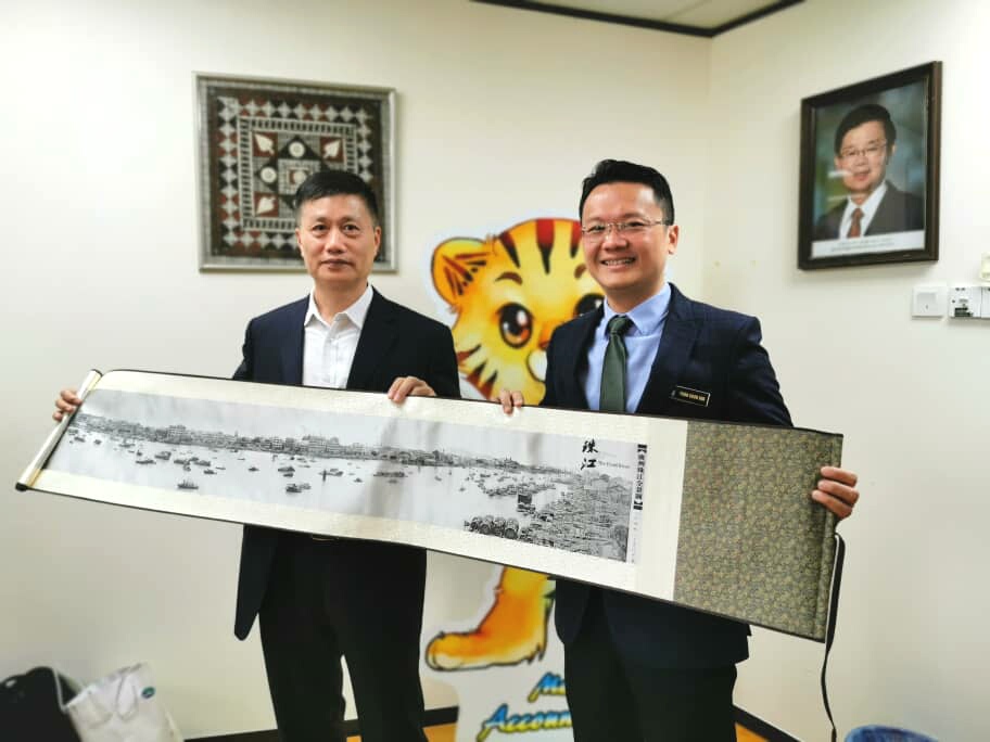 图说:广州市南沙开发区管委会副主任潘玉璋(左)赠送纪念品予槟城州政府旅游部,由杨顺兴代领。