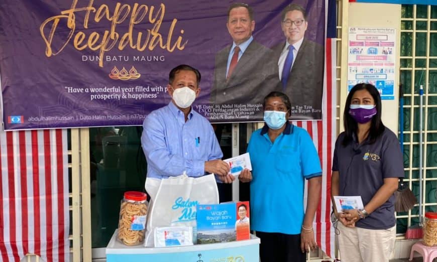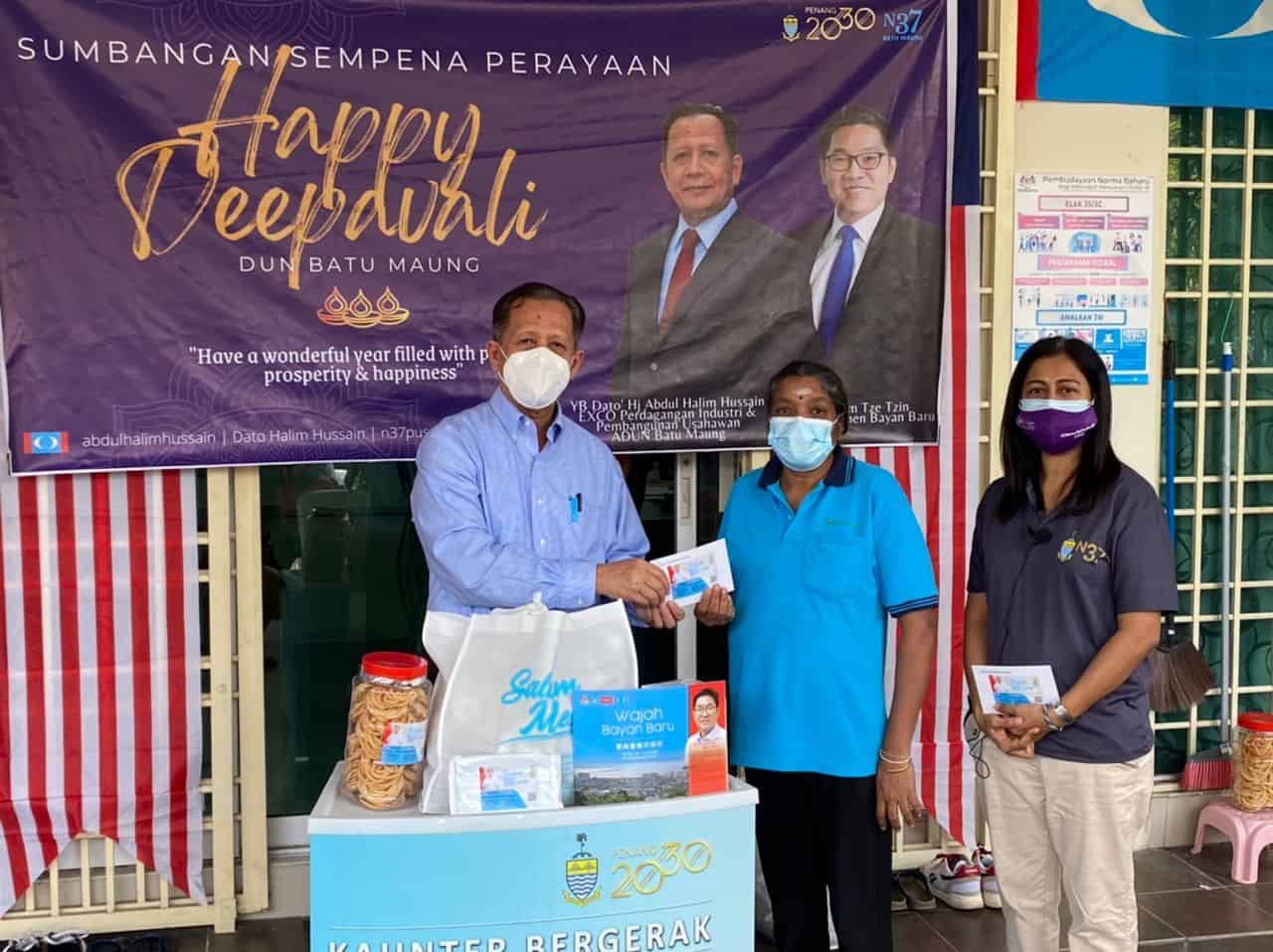 配合即将到来的屠妖节,峇都茅区州议员拿督阿都哈林在选区服务中心分派200份食物篮、红包、熟食及佳节小食姆鲁古(Muruku)予区内的印裔家庭,与他们共享佳节喜悦。受惠的印裔居民包含乐龄人士、单亲家庭、B40群体以及生计受新冠疫情影响的家庭。