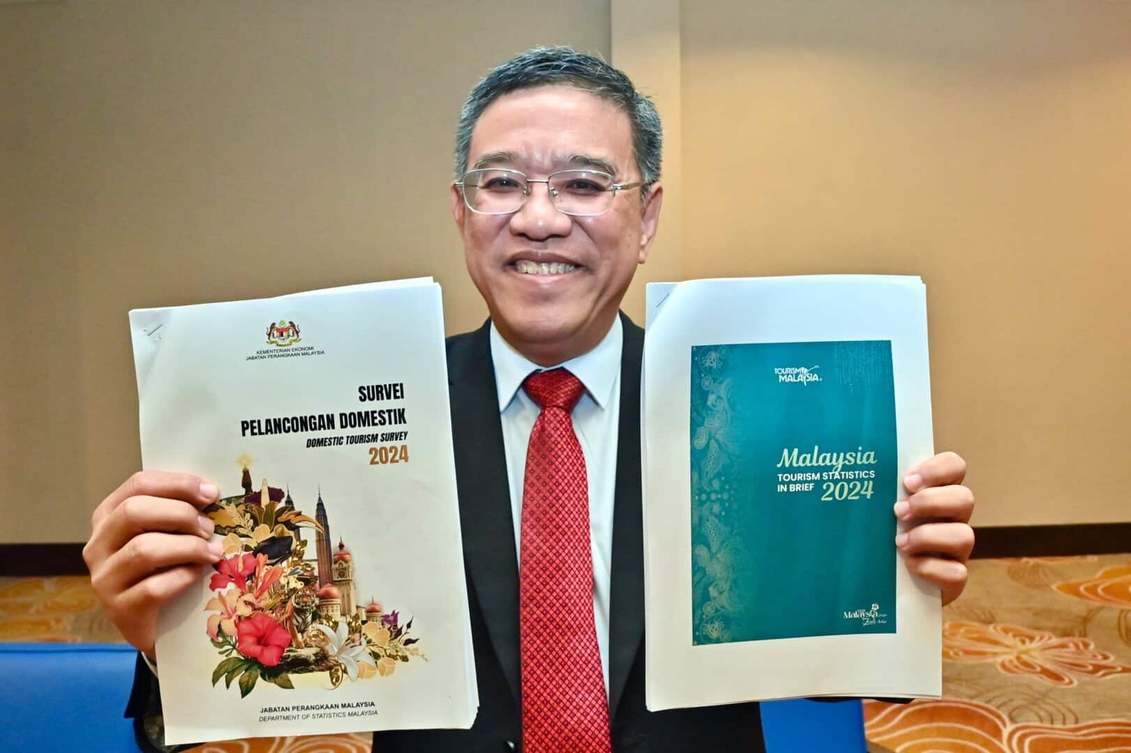 ////图说:黄汉伟展示《2024年国内旅游抽样调查》(左)及《2024年马来西亚旅游局官方数据》。他指出,马来西亚旅游局官方数据才能真正反映各州旅游情况。