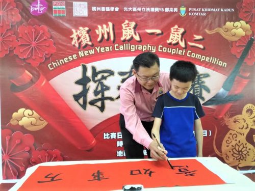槟州書艺学会主办、光大区州议员郑来兴服务中心协办、槟州首席部长和PDC Setia Urus私人有限公司赞助的“槟州鼠一鼠二挥春比赛”,今午在光大热烈举行,获得逾百名男女老少参加,反应热烈。
