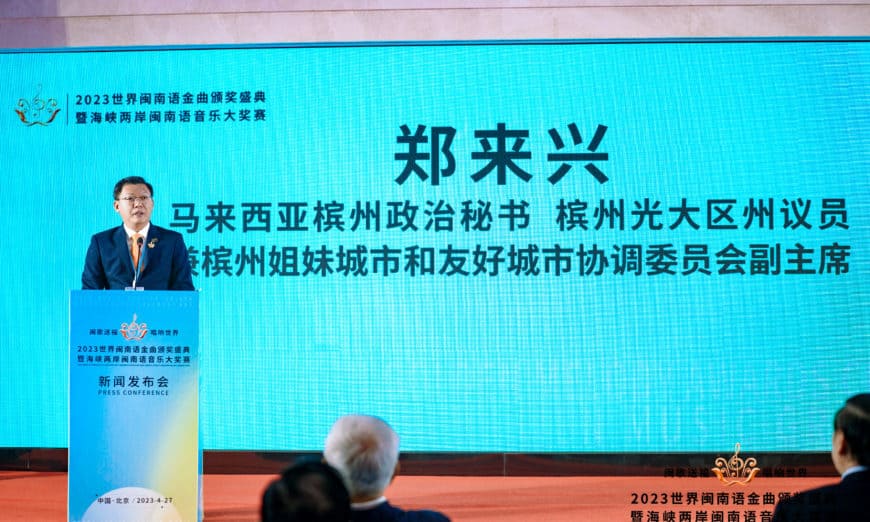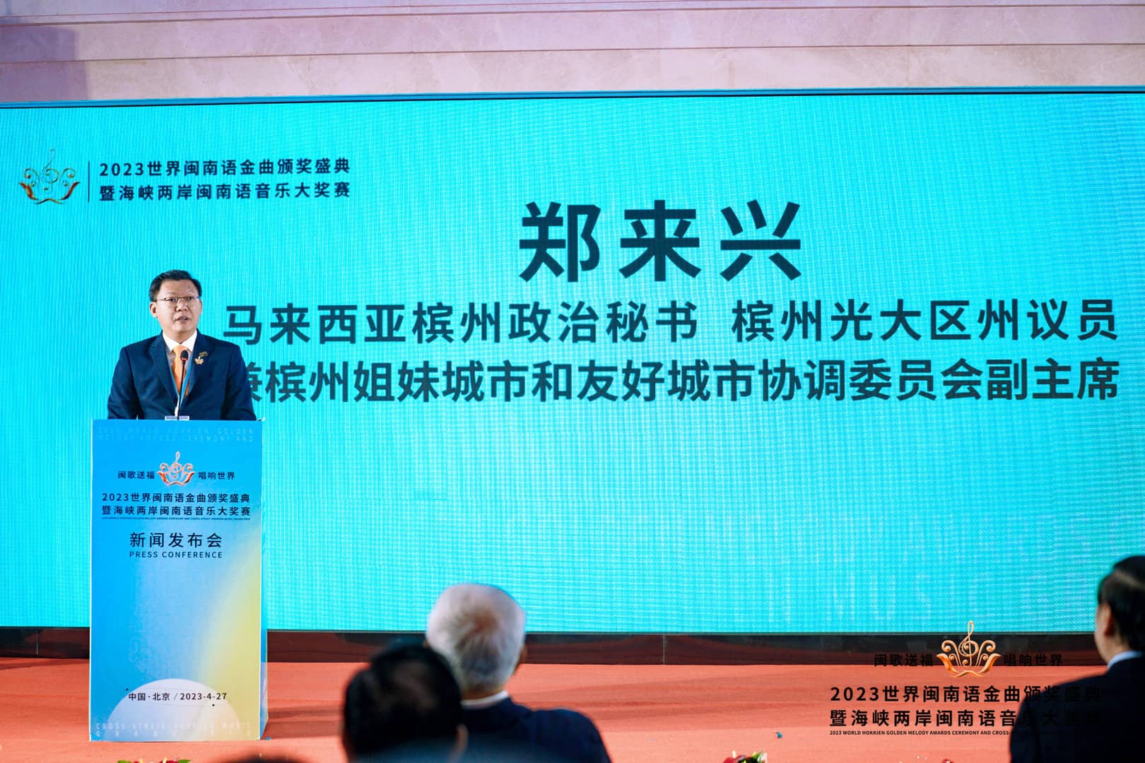 槟州首长政治秘书,光大区州议员兼槟州姐妹城市和友好城市协调委员会副主席郑来兴,于2023年4月27日出席在北京福建大厦福建堂举办的“2023世界闽南语金曲颁奖盛典暨海峡两岸闽南语音乐大奖赛新闻发布会”,场面人山人海、非常壮观。