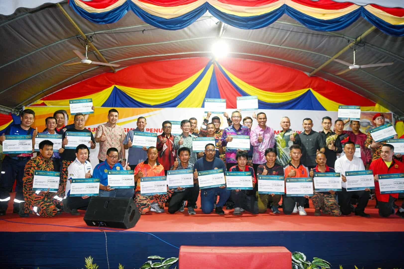 会上,首长也颁发1万令吉模拟支票,予全槟36队义务消防队,并由槟州行政议员方美铼陪同。
