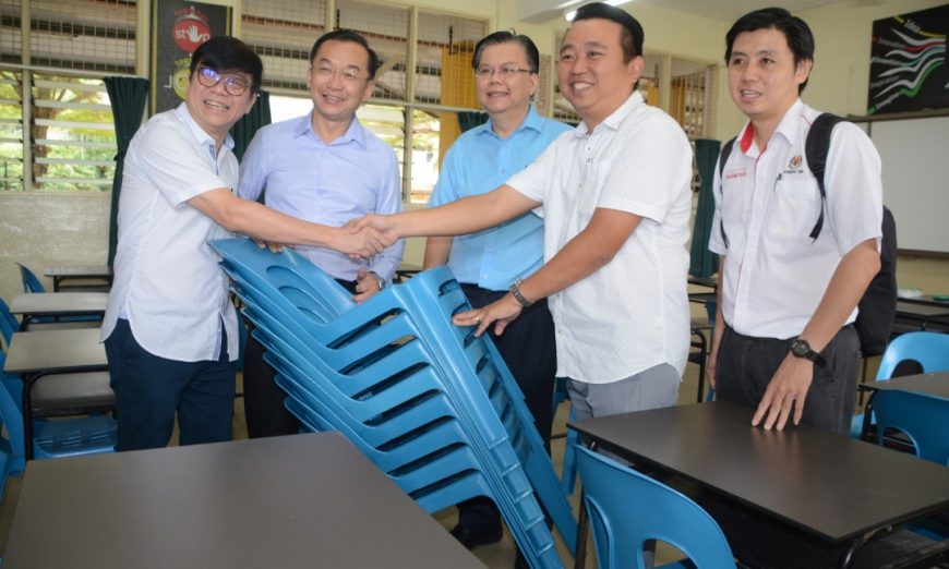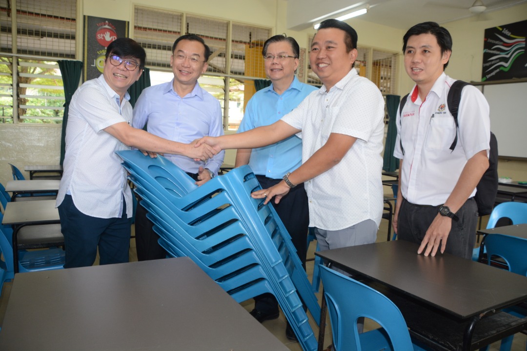 AIR ITAM – Ahli Parlimen Bukit Gelugor, Ramkarpal Singh menyerahkan 500 unit kerusi plastik kepada Sekolah Menengah Jenis Kebangsaan (SMJK) Chung Ling di sini pagi ini.