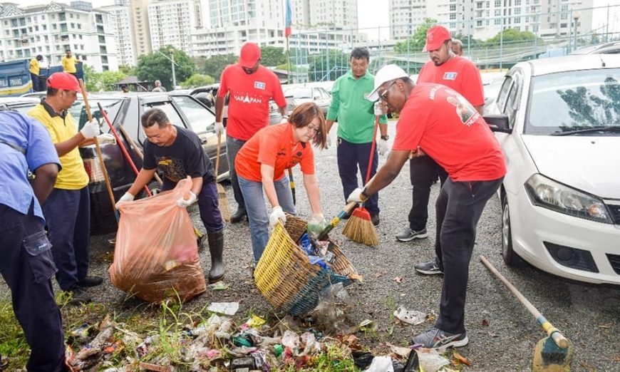 BERSIHKAN… Sejajar hasrat Kerajaan Negeri dalam menjadikan kawasan persekitaran selesa untuk didiami komuniti setempat, satu gotong-royong diadakan di Flat Medan Tengku, Jelutong, semalam.