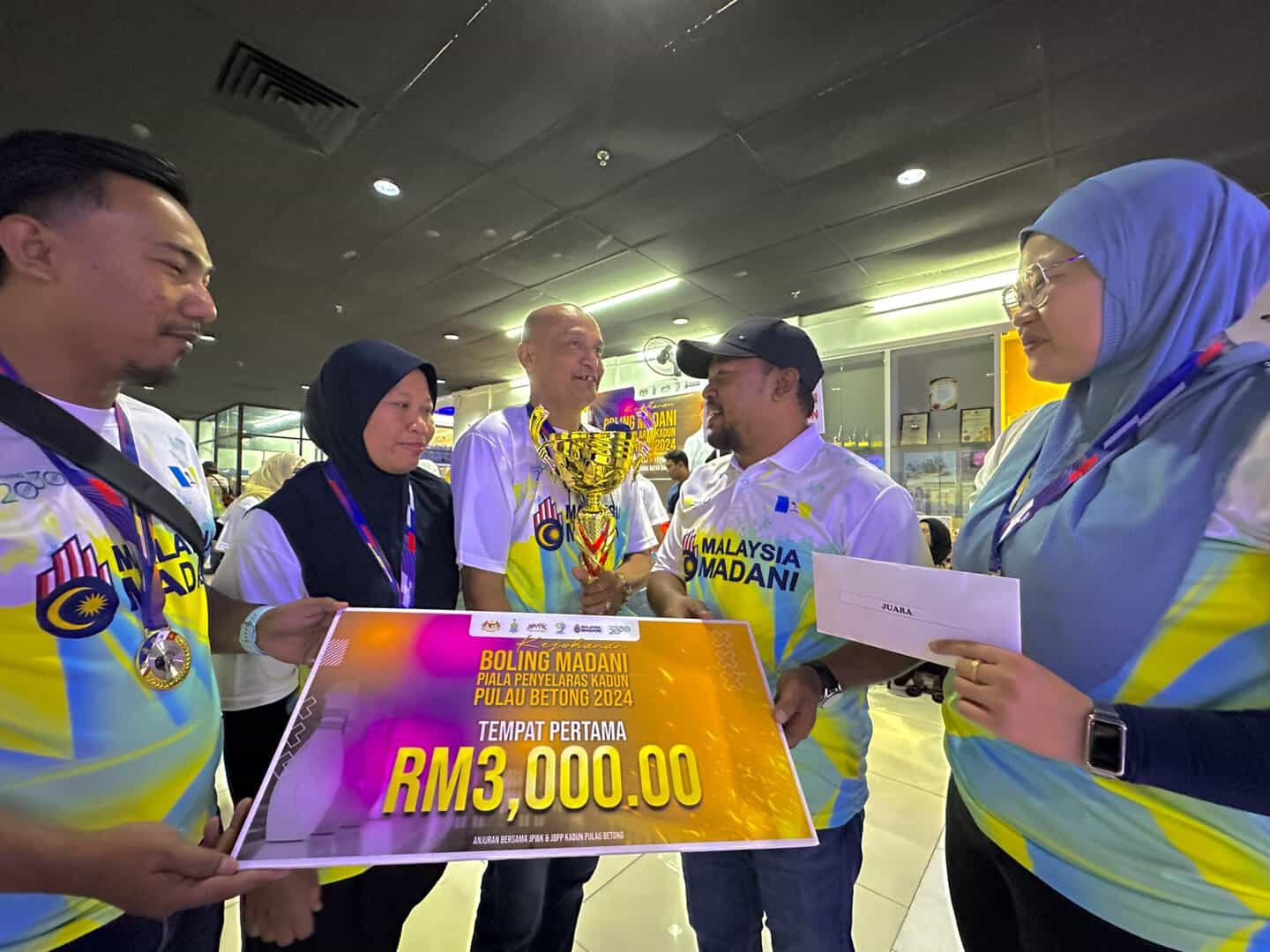 PANTAI JEREJAK – Polis Diraja Malaysia (PDRM) Balik Pulau muncul sebagai juara Kejohanan Boling Madani Piala Penyelaras KADUN Pulau Betong, diikuti Bendahara (kedua) dan Maktab Rendah Sains Mara (MRSM) Balik Pulau di tempat ketiga dalam saingan 25 pasukan yang berlangsung Aspiratian Centre, Sunshine Bayan Baru di sini pada 23 November 2024.