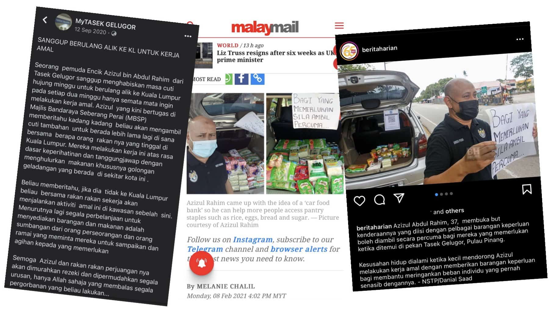 Bersikap hati baik, padanlah Azizul Abdul Rahim,38, melakukan kerja amal kebajikan tersebut dengan dibantu anak perempuannya selepas waktu kerja semasa tempoh pendemik telah mendapat perhatian beberapa akhbar arus perdana dan laman Facebook tertentu.