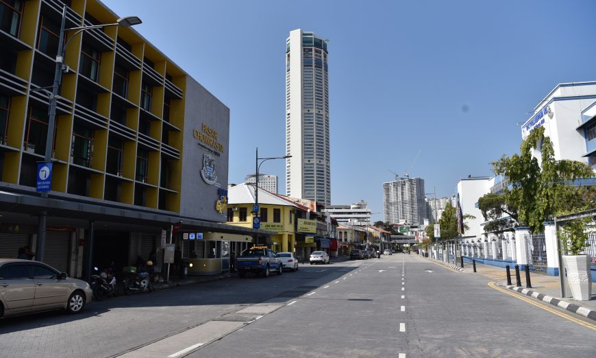 Jalan Penang dan Kompleks Tun Abdul Razak (KOMTAR) yang kebiasaannya sibuk dengan aktiviti pelancongan dan urusan harian dilihat sunyi tidak seperti hari kebiasaannya.