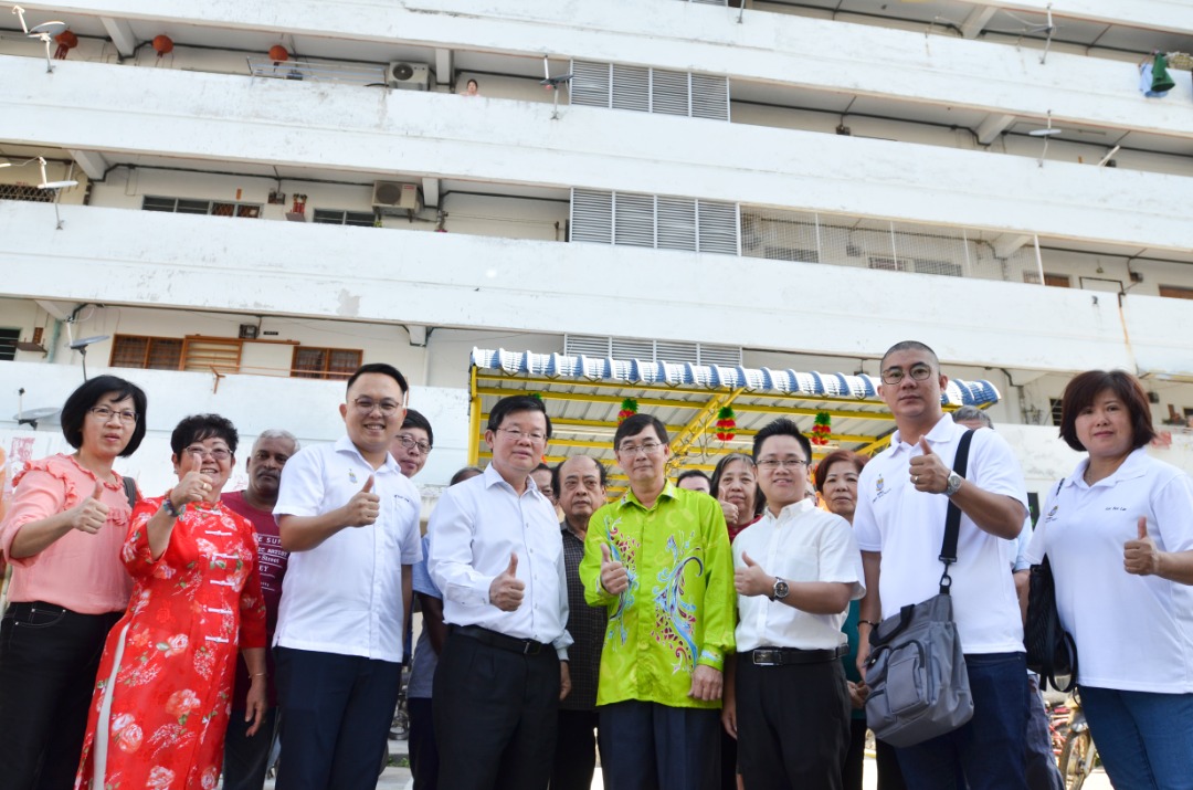 Ahli Dewan Undangan Negeri (ADUN) Pengkalan Kota, Daniel Gooi dan Pengerusi Perbadanan Pengurusan Blok 350 Gat Lebuh Macallum, Henry Oh turut sertai Kon Yeow turun padang melihat projek yang telah siap tersebut.