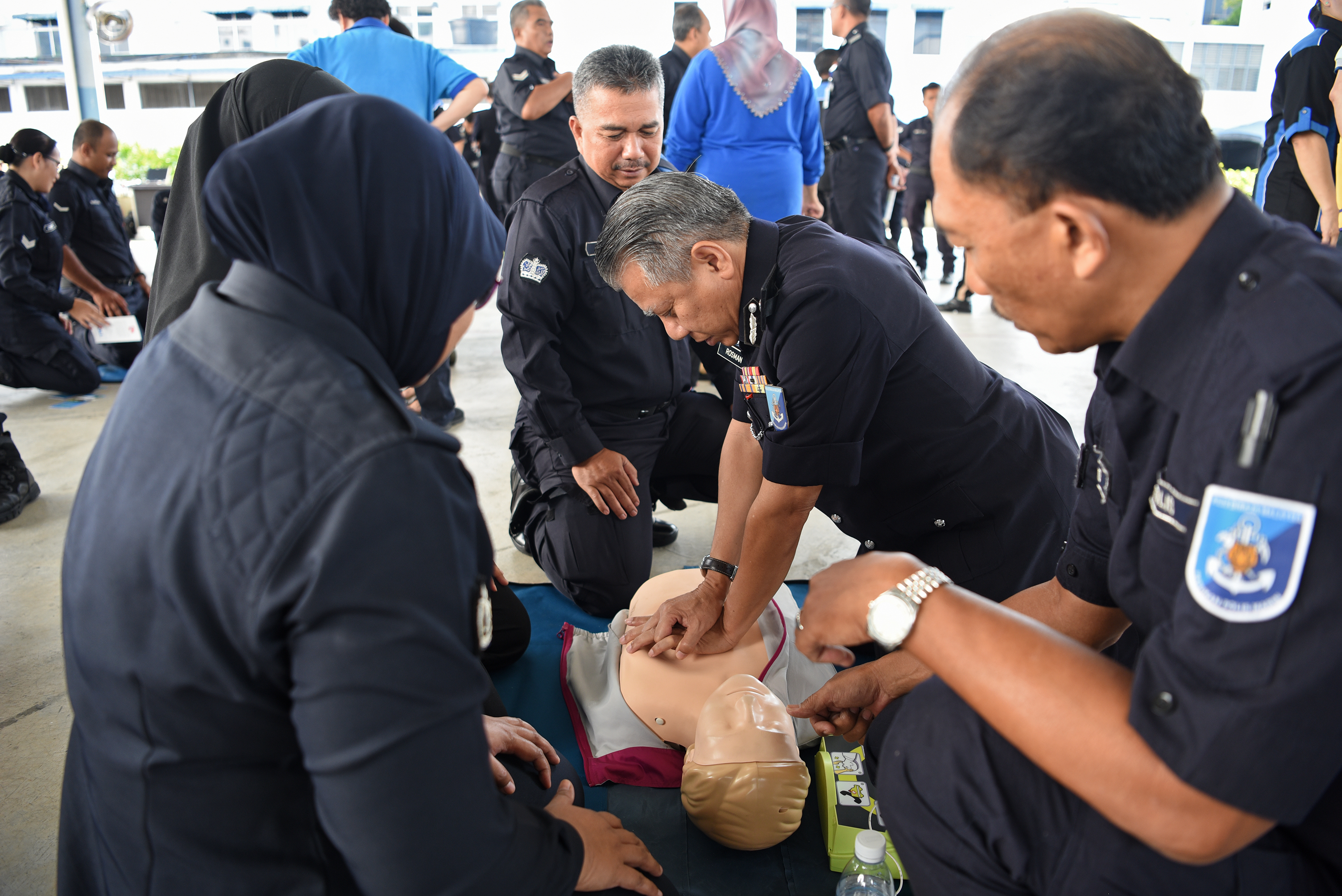 Members of St John Ambulance, Malaysian Red Crescent, Community Emergency Response Team (CERT) George Town and the Penang Hospital were present to guide the Penang police personnel on how to perform CPR using AED.