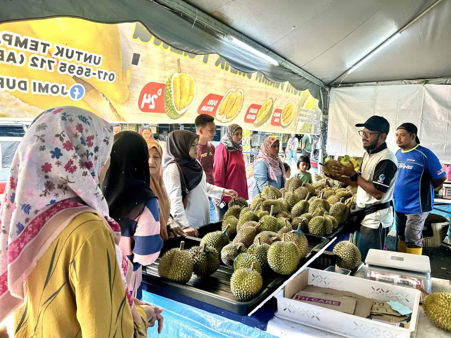 “(Dan) di sini juga terdapat lebih tiga gerai yang menjual buah durian (serta buah-buahan yang lain) pada kadar harga pasaran yang sama serta tidak terlalu tinggi dan mahal, bagi yang datang ke sini sudah tentu harga potongan istimewa sehingga RM10 ditawarkan.
