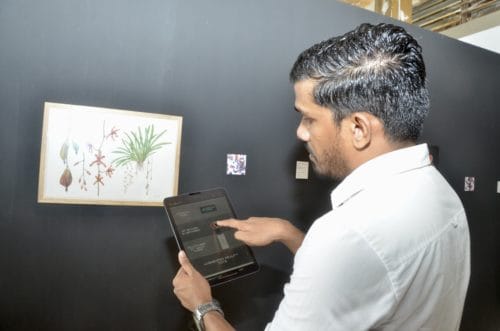 “To do that, one needs to download an app, called PERK Reality, on a smartphone or a tablet. This would allow the viewers to scan the patterned tile beside each physical artwork in one gallery to view the augmented artwork from the other gallery through the digital device.