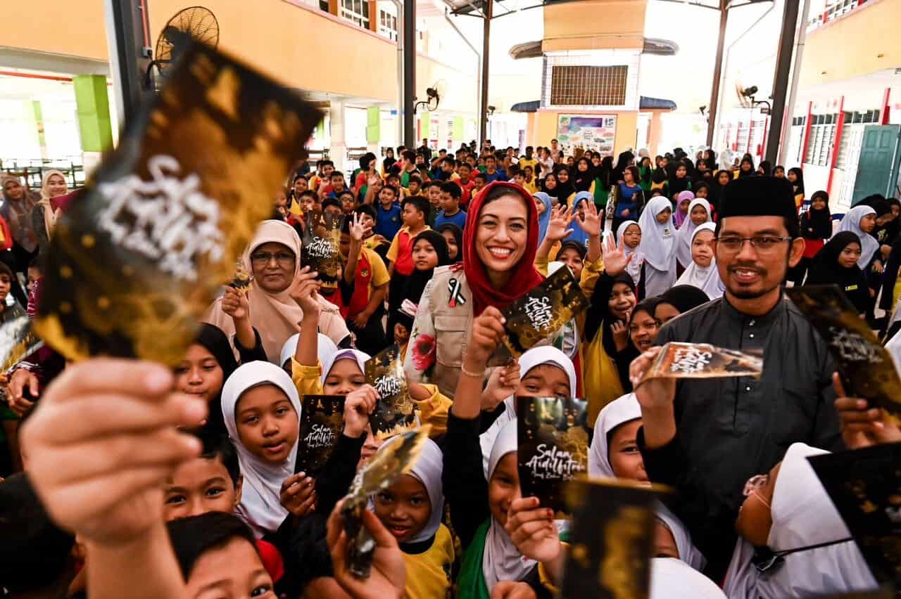 Dengan diiringi Kulsom dan barisan guru SKTT lain, Syerleena kemudiannya menyampaikan duit raya Aidilfitri RM5 seorang kepada 399 murid terpilih.