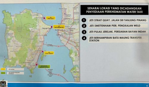 “We have identified four proposed pier locations for the water taxi services, namely, Straits Quay, Weld Quay, Pantai Jerejak, and Batu Maung. These locations are the basic requirements for the RFP.