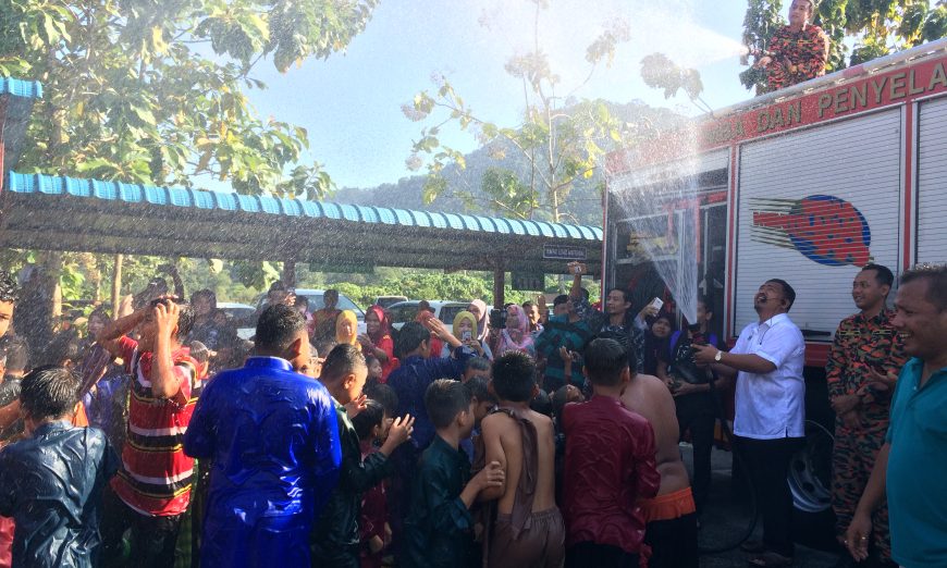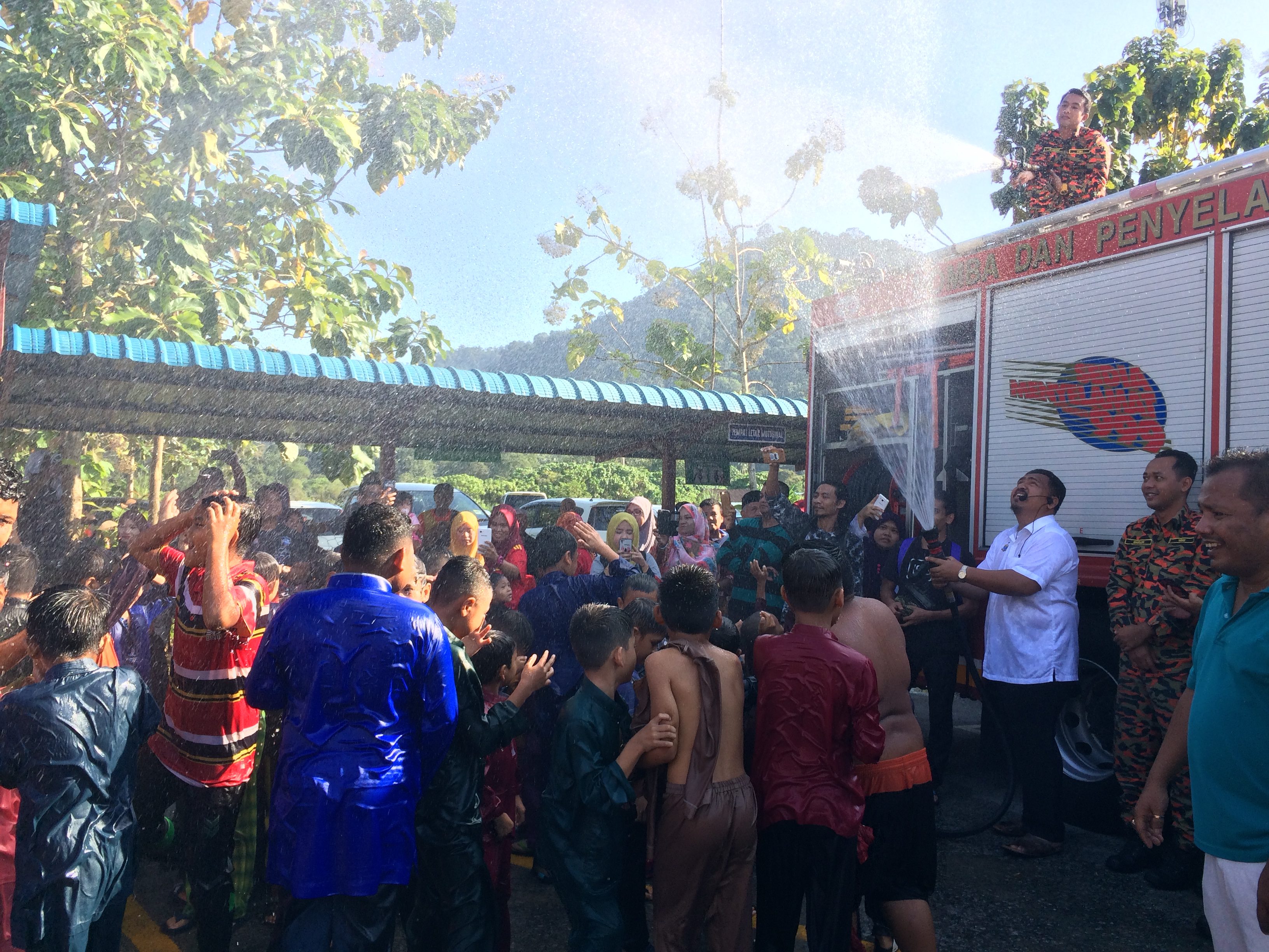 Sejurus tiba, bagi mengurangkan ‘debaran’, para peserta dimandikan menggunakan pancuran pili dari pasukan Jabatan Bomba dan Penyelamat Malaysia (Bomba).