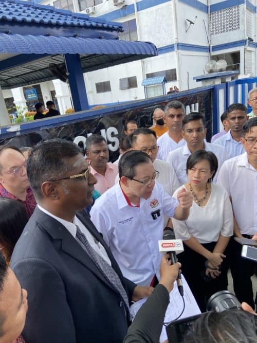Guan Eng bersama-sama Ahli Parlimen Jelutong, R.S.N. Rayer hadir ke ibu pejabat polis berkaitan pada pagi ini bagi membuat laporan berikutan kenyataan yang dikeluarkan oleh pemimpin berkenaan beberapa hari lepas.