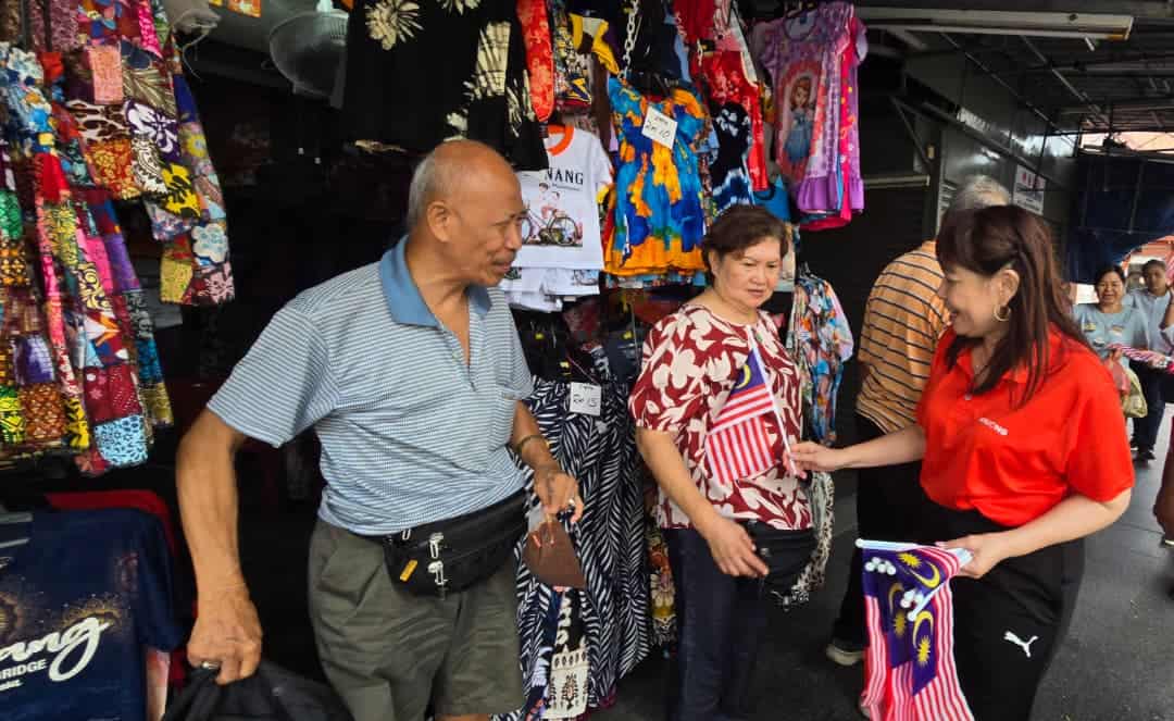 Deputy Finance Minister Lim Hui Ying joined the public at Chowrasta Market on Sunday morning (Aug 10) for a walkabout and flag distribution programme in conjunction with the upcoming National Day celebrations.