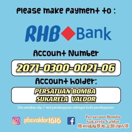 Donations can be made to the Persatuan Bomba Sukarela Valdor (RHB account-20710300002106).